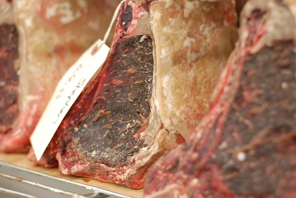 Aging improves tenderness and flavor as it reduces moisture levels – this Tony’s Standing Rib has 3 weeks of age, one week left to go and we’ll custom cut it for this customer. Custom aging and cutting available in all our markets.